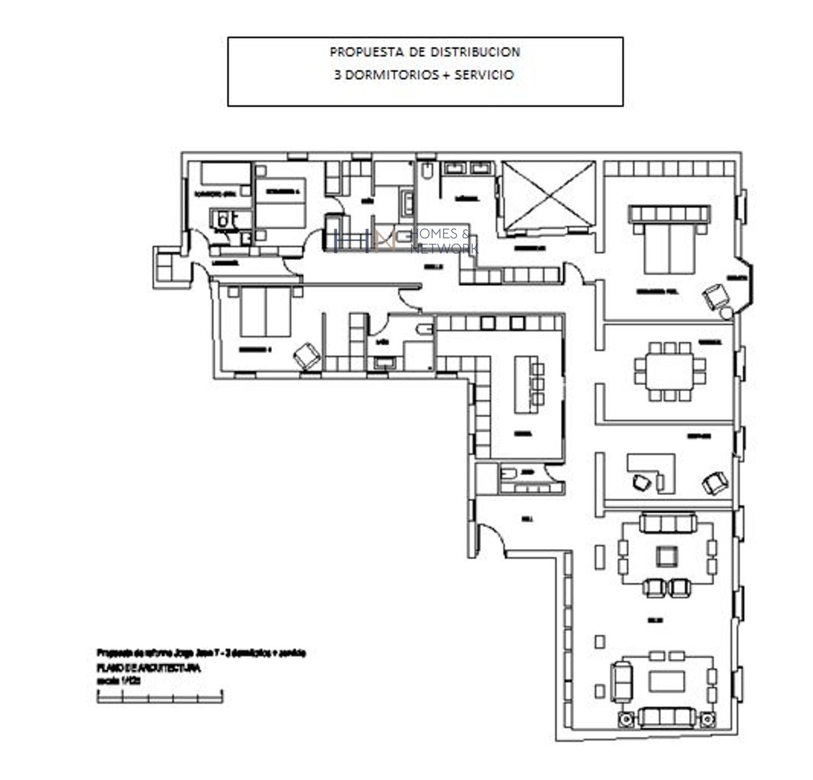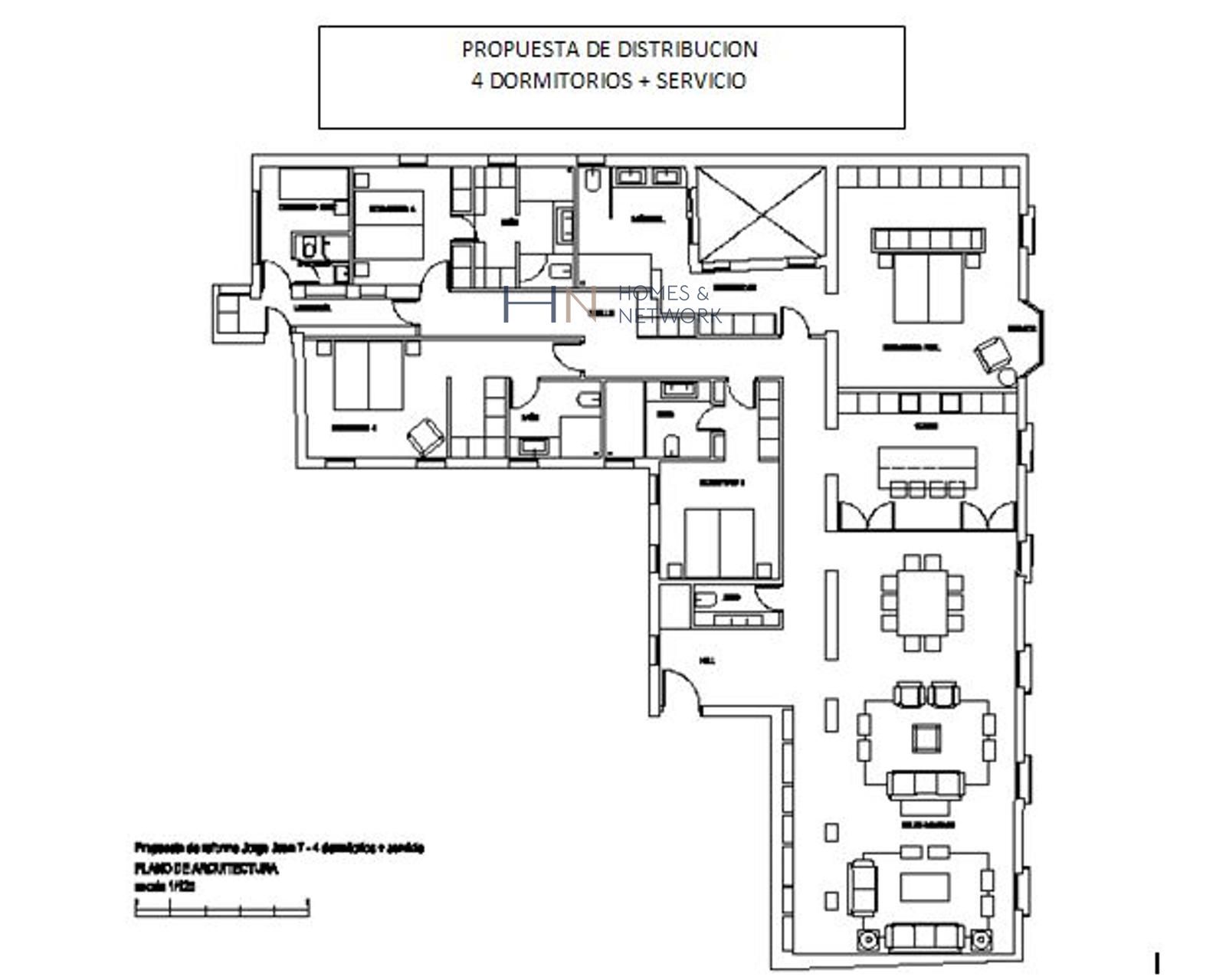Se distribuye en un hall de entrada con ventana, un amplio salón doble con tres balcones, un comedor independiente con un balcón y una sala de estar con un mirador y otro balcón. El dormitorio principal da a la calle y cuenta con baño en suite, un gran vestidor y un balcón. También dispone de un aseo de visitas, otros dos amplios dormitorios con sus baños en suite, una cocina amplia, lavadero y un gran comedor de diario, además de dormitorio y baño de servicio.